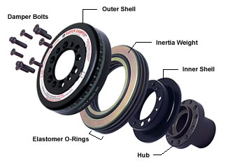 The factory harmonic damper / crankshaft pulley is composed of an inner and outer steel shell bonded with an elastomer bushing. With age, the factory crankshaft pulley can fail. This process is greatly exasperated by high performance applications, including track use. Failed factory crankshaft pulleys may be viewed online, as it is a well known issue.
