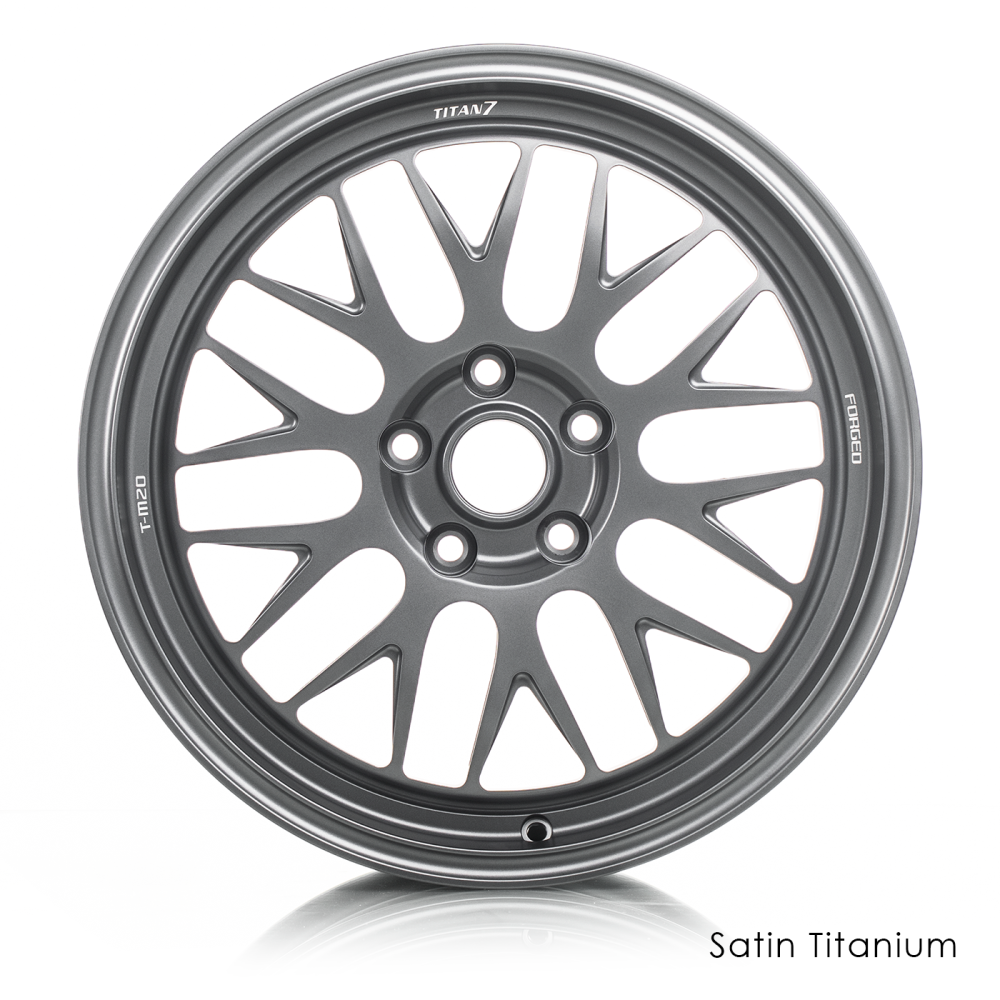 Pressurized with 10,000 TONS of industry leading pressure to give you a wheel that is the ultimate lightweight to strength to inspire confidence in any style of competitive or leisure driving. Upon close inspection you will notice “I- Beam” spokes which are strategically placed to give the wheel rigidity while keeping weight to a minimum. The iconic 20 spoke mesh design was chosen to pay homage to classic Touring Racing series. Each wheel from Titan 7 features our improved traction improving bead seat knurling, beefed up inner rim flange for durability and strength, and logo machined accents. The T-M20 is designed for each application to clear all popular after market big brake kits while achieving maximum concavity. All wheels are durability tested according to JWL standards to ensure safety while you perform. Authentic performance from Titan 7. Forged for All.
